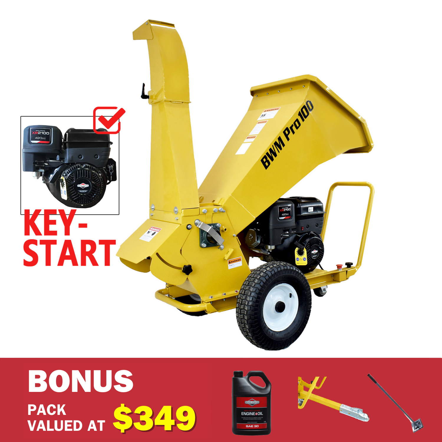 Bonus deal includes a tow bar, feeding push rod, Briggs & Stratton 4L engine oil (Bonus pack valued at $349! Limited time only!)