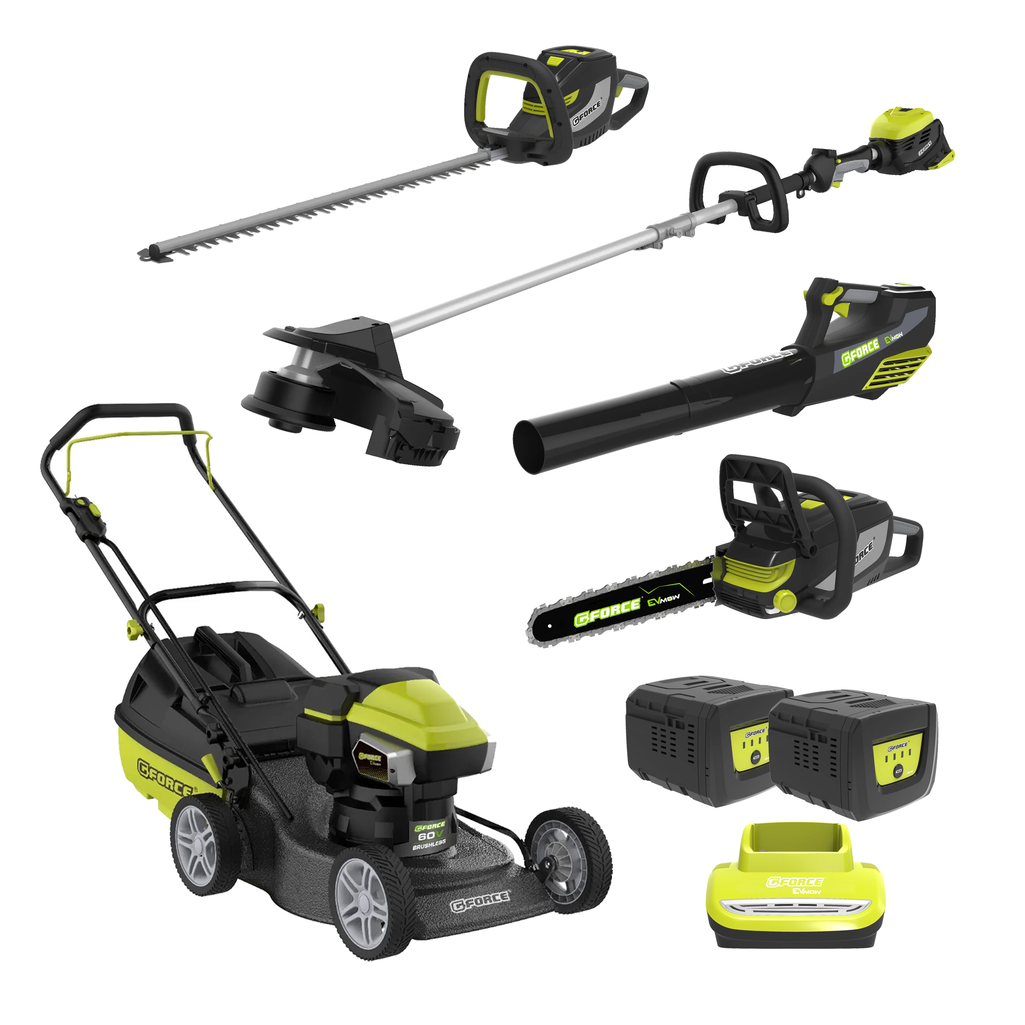 Combo Kit includes 1x Mower, 1x Line Trimmer, 1x Chainsaw, 1x Blower, 1x Hedge Trimmer, 1x 60V Charger, 2x 60V 5Ah Battery.