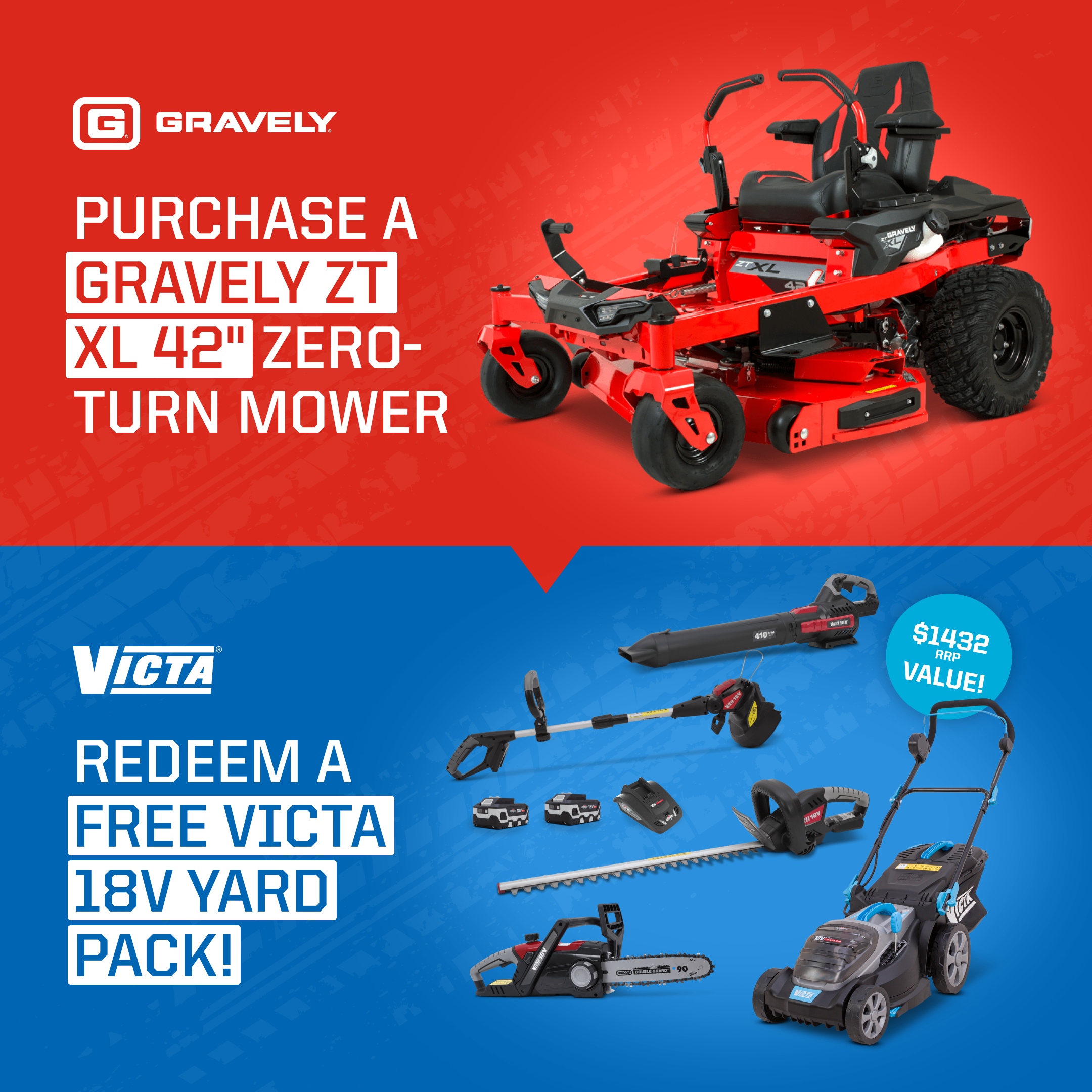 *How to redeem: 1. Jump onto the redemption page and fill out the claim form. 2. Upload your receipt and punch in your mower serial number and delivery details. 3. Hit submit and sit tight — your Victa Yard Pack will land at your door once approved (usually within 14 business days). (available on the Gravely website https://website.gravely.com.au/promotion/zt-xl-promo-free-victa-18v-yard-pack or our staff can assist you) *Offer valid till 30th April 2026 or While Stocks Last.