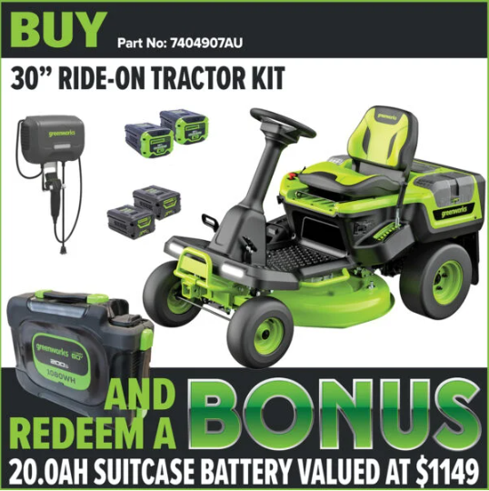 Purchase the 60V 30” Ride-On Tractor Kit which includes: 1x GREENWORKS 60V 30” Ride-On Tractor 2x GREENWORKS 60V Pro 4.0Ah Li-Ion Battery 2x GREENWORKS 60V Pro 8.0Ah Li-Ion Battery 1x GREENWORKS 60V Wall Mounted 1.5kW Charger And receive FREE via redemption: 1x GREENWORKS 60V 20.0Ah Suitcase Battery (Available January 1st to March 31st 2026. Redeem by April 10th 2026)