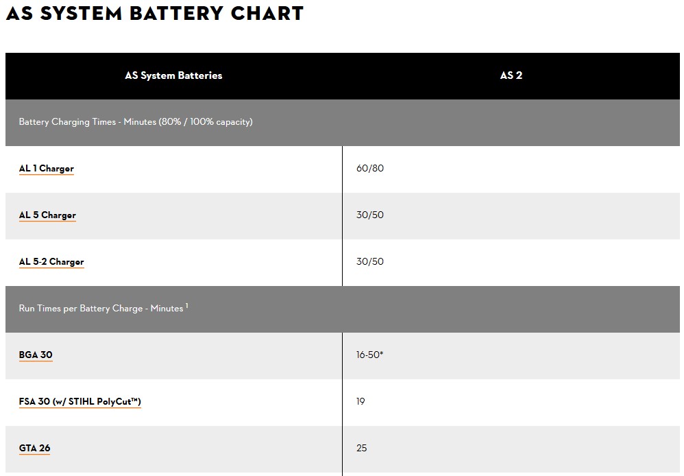 For details on the running time, please click the link below. STIHL AS System Battery Chart: https://www.stihlusa.com/guides-projects/a/as-system-battery-chart/![]()