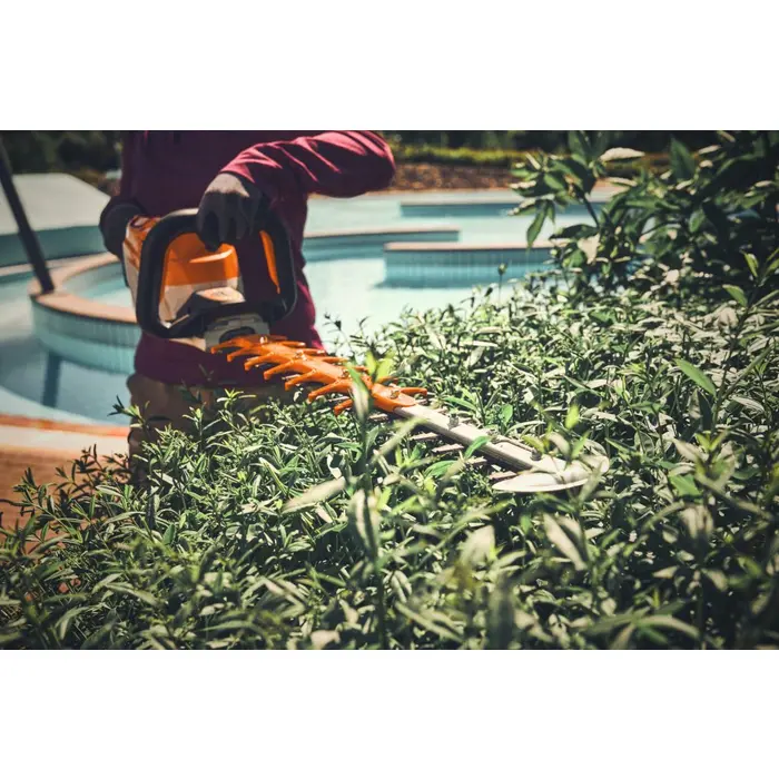 The STIHL HSA 140 T battery hedge trimmer delivers exceptional cutting performance for professionals in garden and landscape maintenance and municipal operations. With its double-sided cutting blades in a trimming configuration, this hedge trimmer is designed to produce clean, accurate cuts on shrubs and hedges.