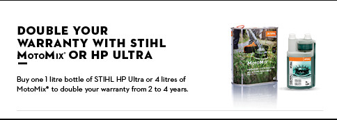 Double your warranty when you buy one bottle of 1 Litre of STIHL HP Ultra Two Stroke oil or 4L of STIHL MotoMix with your order*