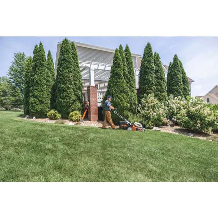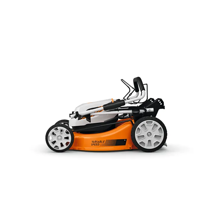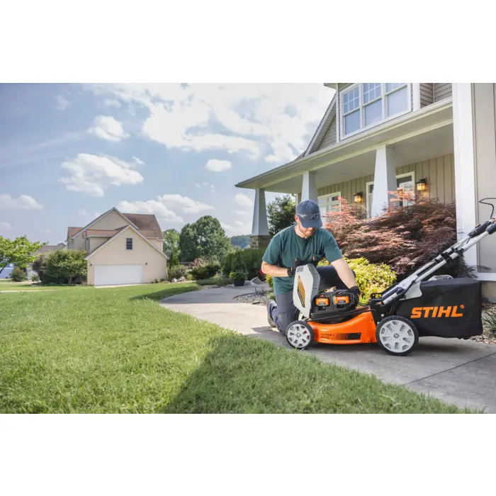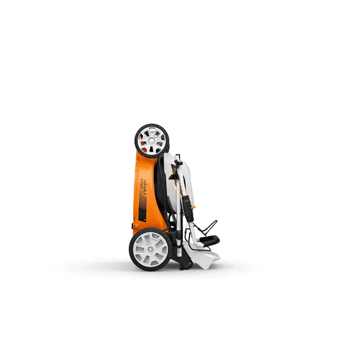 The STIHL RMA 353 V has a robust sheet steel housing and central cutting height adjustment, which allows you to choose the desired length of your lawn in 8 settings from 25 mm to 100 mm. The 60-litre textile grass catcher box is easy to empty and transport. Alternatively, you can apply the clippings directly to the grass as mulch or discharge them to the side. All you have to do is use the supplied mulching insert. The twice-foldable handlebar with softgrip handle supports ergonomic working and also makes it possible to transport the battery lawn mower easily and store it compactly.